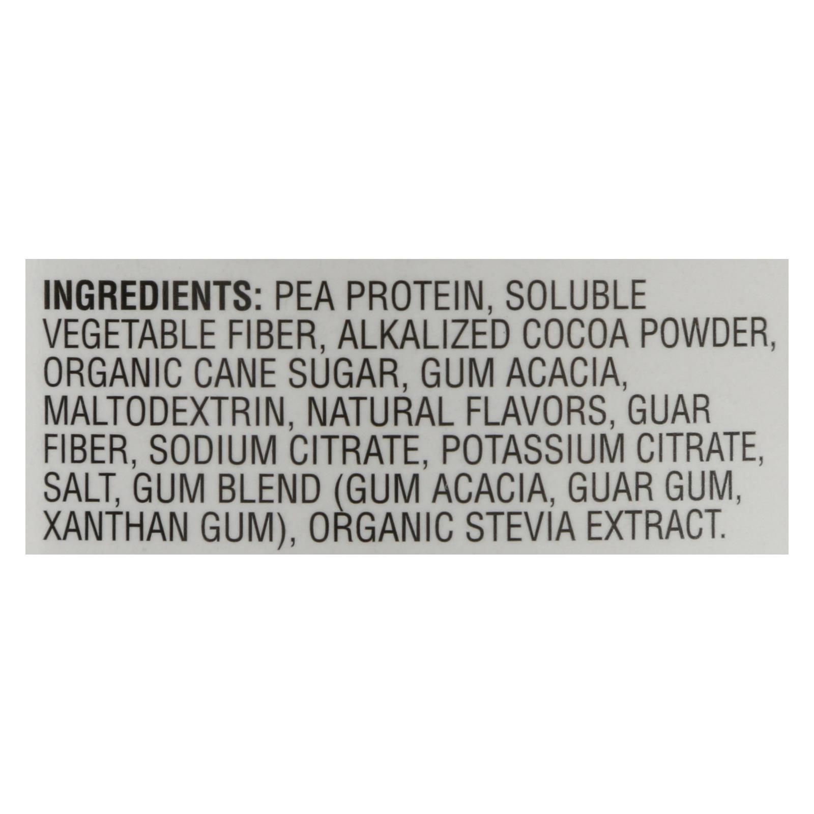 ingredients : pea protein;soluble vegetable fiber;alkalized cocoa powder;organic cane sugar;gum acacia;maltodextrin;natural flavors;guar fiber;sodium citrate;potassium citrate;salt;gum blend (gum acacia, guar gum, xanthan gum);organic stevia extract