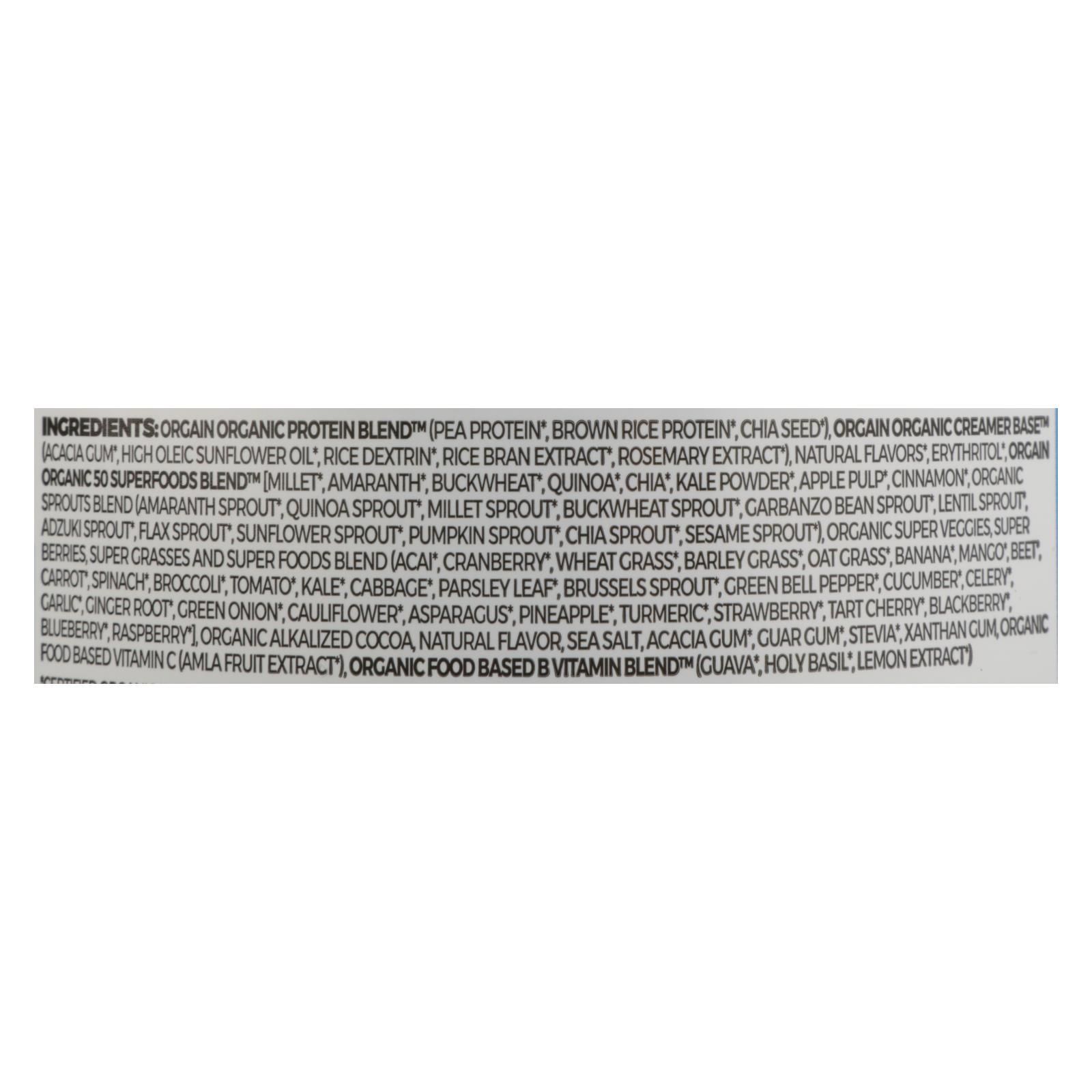 ingredients : orgain organic protein blend (pea protein*, brown rice protein*, chia seed*);orgain organic creamer base (acacia gum*, high oleic sunflower oil*, rice dextrin*, sunflower lecithin*, rosemary extract*);natural flavors;erythritol;orgain organic 50 superfoods blend [millet*, amaranth*, buckwheat*, quinoa*, chia*, kale powder*, apple pulp*, cinnamon*, organic sprouts blend (amaranth sprout*, quinoa sprout*, millet sprout*, buckwheat sprout*, garbanzo bean sprout*, lentil sprout*, adzuki sprout*,