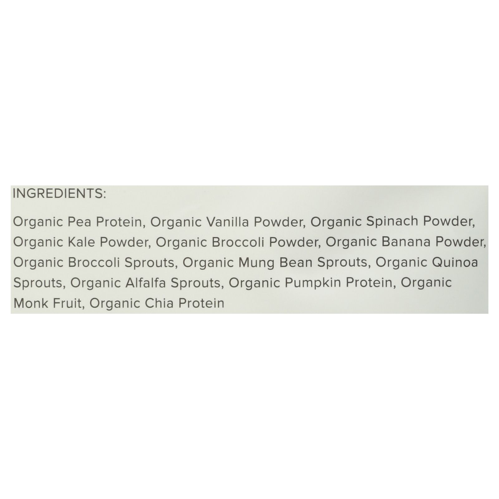 ingredients : organic pea protein;organic vanilla powder;organic spinach powder;organic kale powder;organic broccoli powder;organic banana powder;organic broccoli sprouts;organic mung bean sprouts;organic quinoa sprouts;organic alfalfa sprouts;organic pumpkin protein;organic monk fruit;organic chia protein