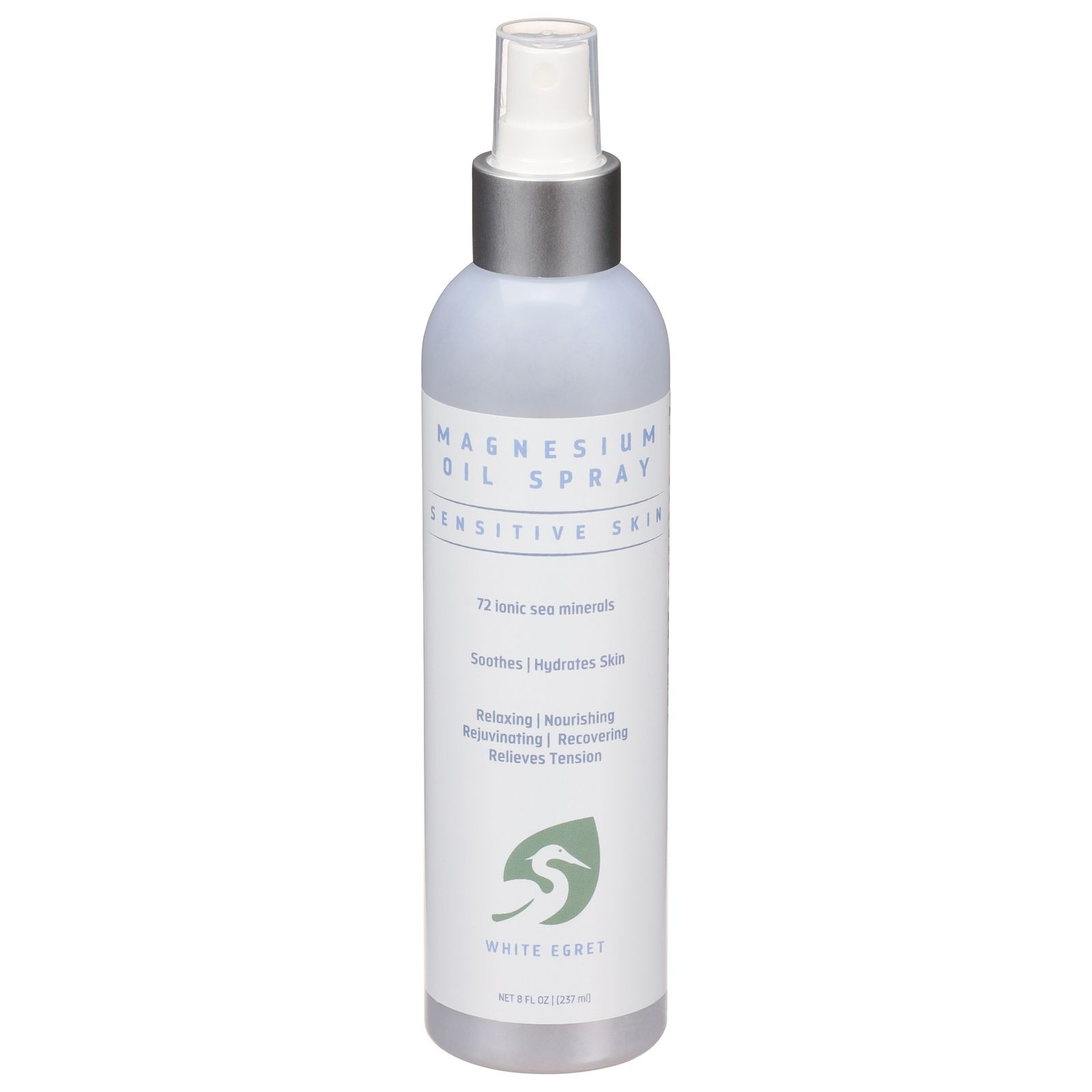 72 ionic sea minerals. Soothes; hydrates skin. Relaxing; nourishing. Rejuvenating; recovering. Relieves tension. Our magnesium oil is harvested through solar evaporation from utah's ancient inland sea, the great salt lake, which is naturally high in ionic magnesium chloride. White egret magnesium oil sensitive skin is a more milk magnesium spray for those with sensitive skin, including children. Our magnesium oil leaves less residue and contains no heavy metals. This product also includes 72 ionic sea minerals in a completely natural, balanced solution. No artificial color or scents. Ph-balanced. No known allergens.